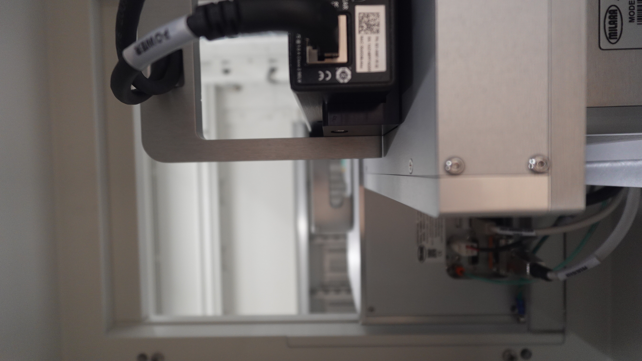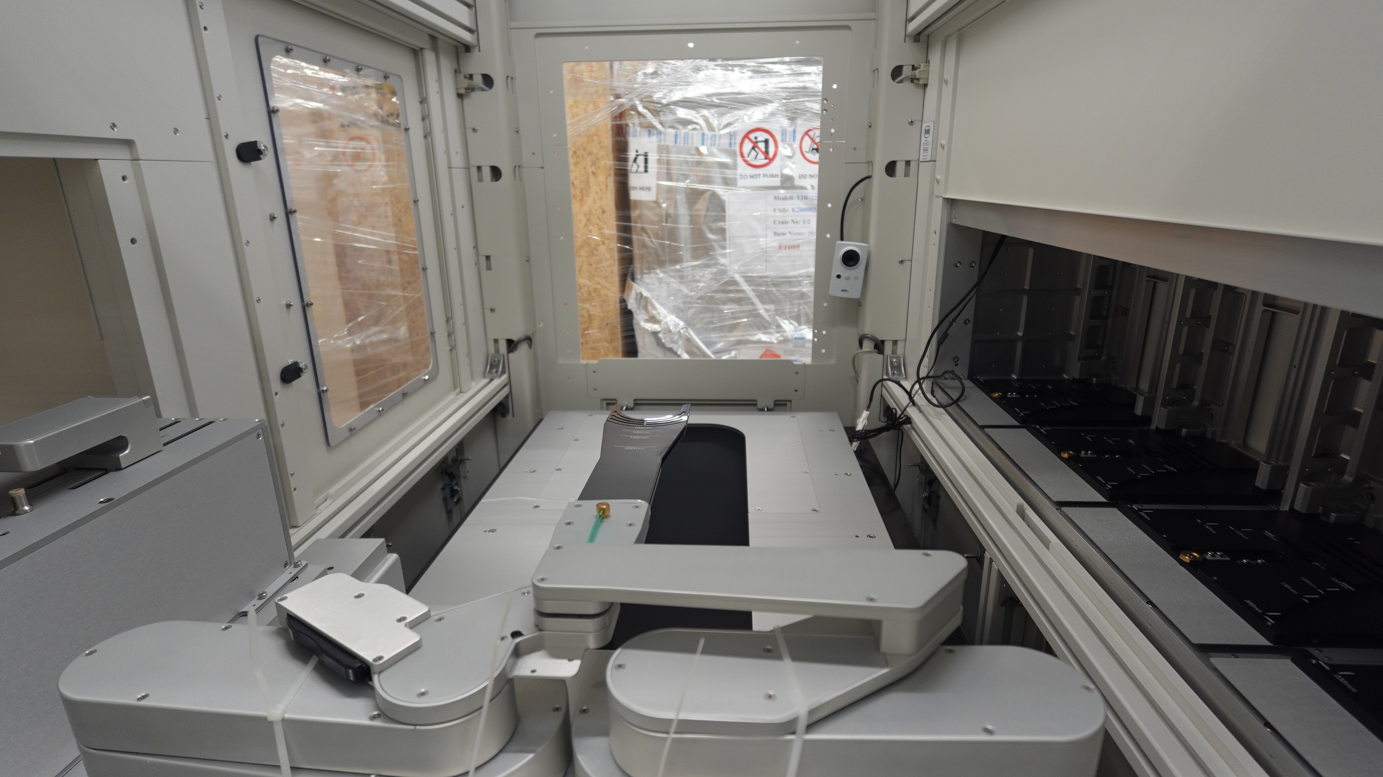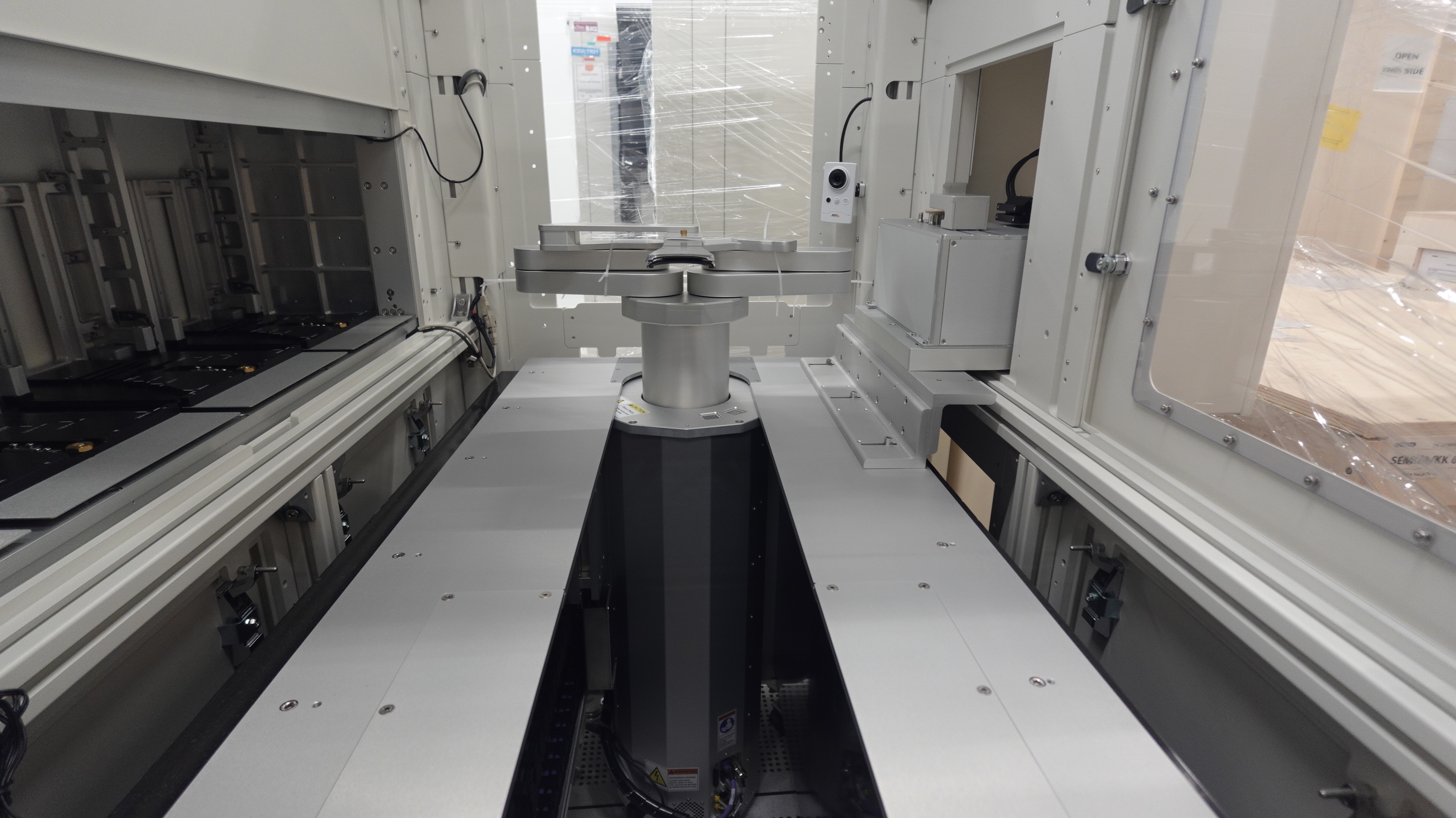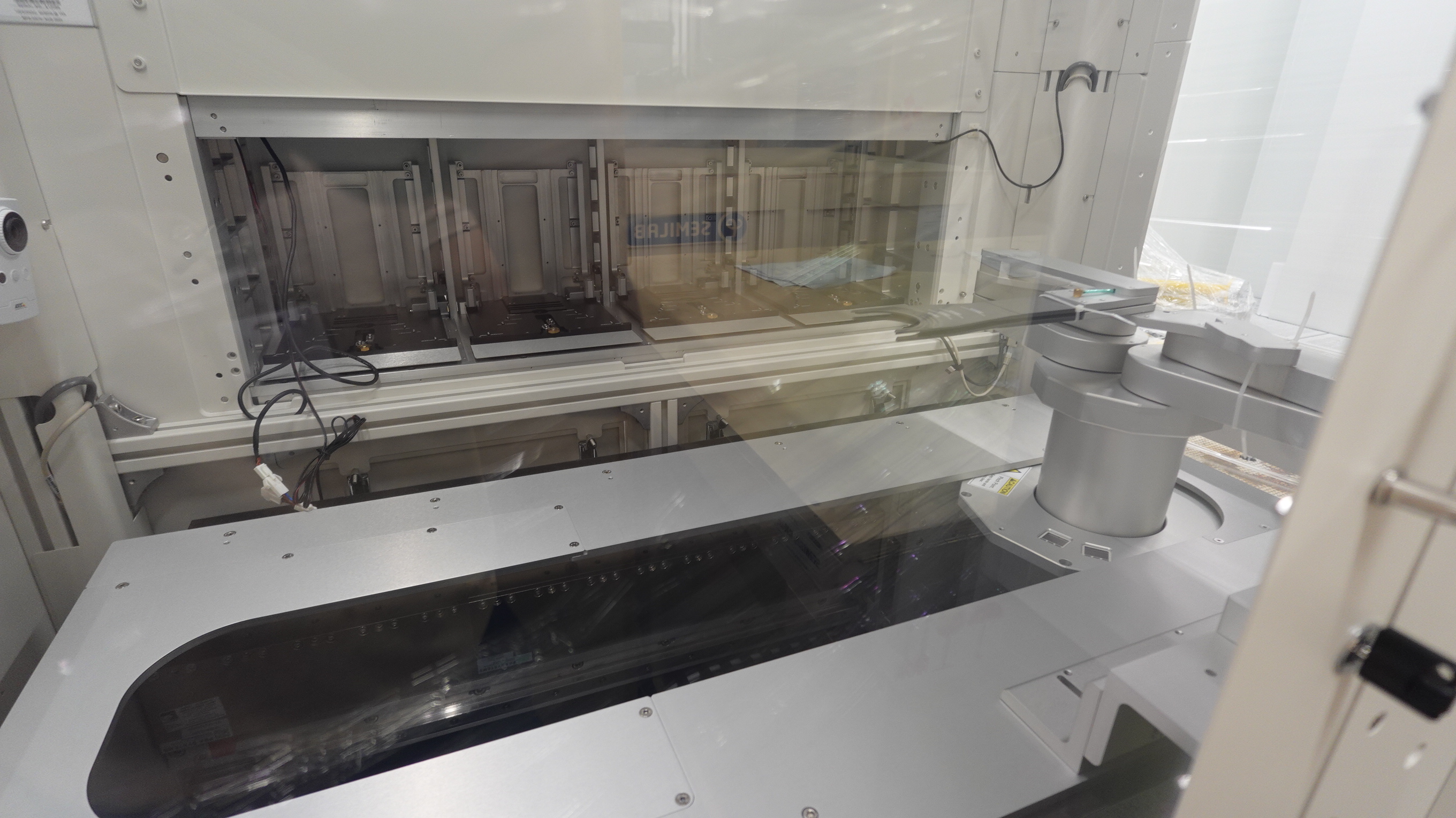 Each cassette station is configurable as input or output. After placing the wafer cassettes at each station, the operator initiates automatic measurement of all wafers in the input cassettes by starting the measurement process at the computer workstation. A scanner is integrated in the end effector of the robot. The scanner allows the robot to determine the location and number of wafers within the cassettes. |