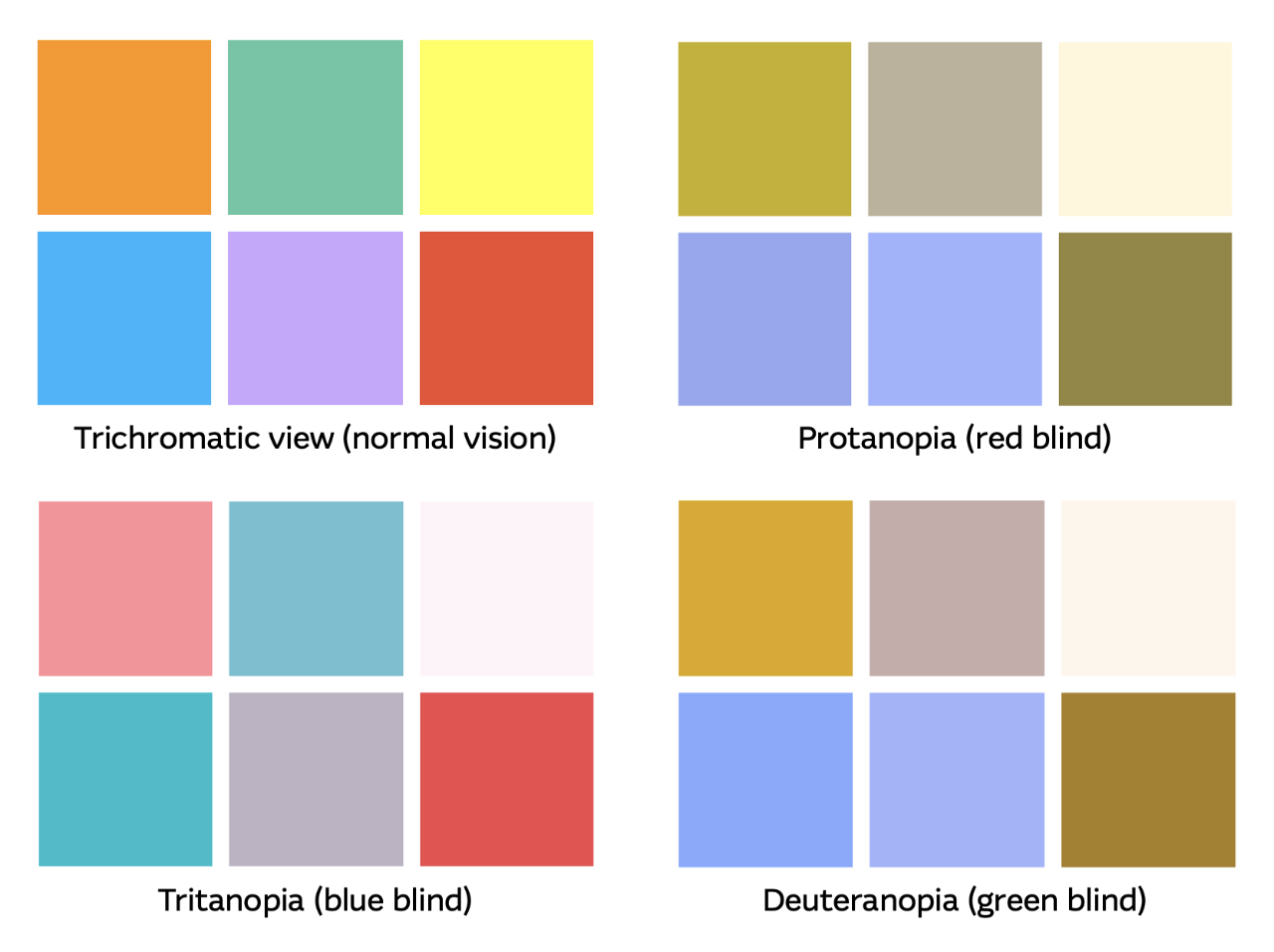 Figure 3: How different types of colour blindness (protanopia, tritanopia, deuteranopia) would affect the visual perception of a palette of colours