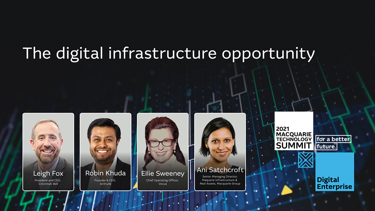 Digital infrastructure enables us to connect with one another and make sense of the vast amount of data with which we are faced. In a discussion hosted by Ani Satchcroft, Senior Managing Director, Macquarie Asset Management, with Robin Khuda, Founder and CEO of AirTrunk, Leigh Fox, President and CEO of Cincinnati Bell and Ellie Sweeney, Chief Operating Officer of Vocus, the panel explore the macro trends that are likely to necessitate investment in many aspects of digital infrastructure, from mobile networks, fibre and cables, to data registers and data centres.