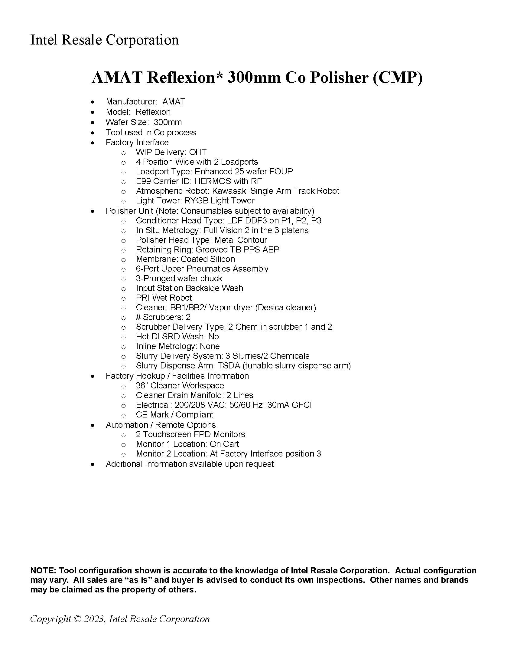 NOTE: Tool configuration shown is accurate to the knowledge of Intel Resale Corporation. Actual configuration may vary. All sales are “as is” and buyer is advised to conduct its own inspections. Other names and brands may be claimed as the property of others.