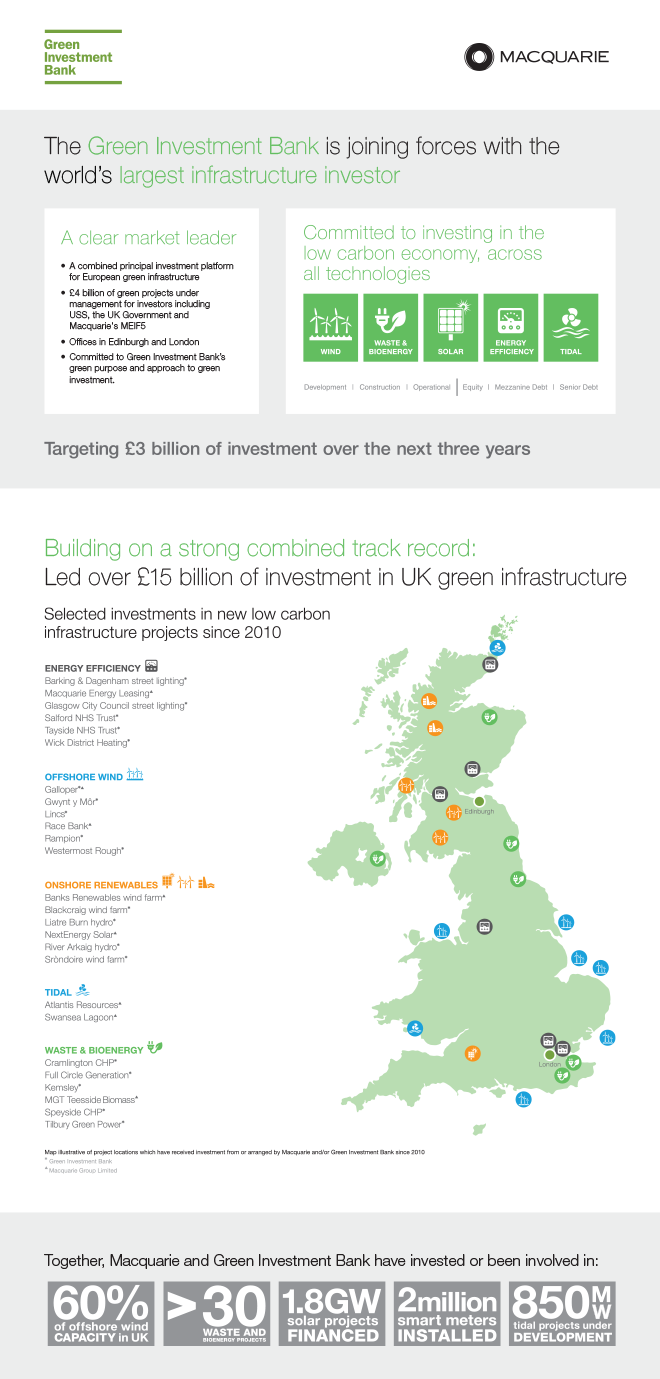 Together, the Green Investment Bank and Macquarie will employ one of Europe’s largest teams of green energy investment specialists, based in Edinburgh and London. A new revenue-generating project delivery team in Edinburgh will provide critical technical, risk, project management and advisory services to green infrastructure investments managed by the Green Investment Bank and Macquarie.