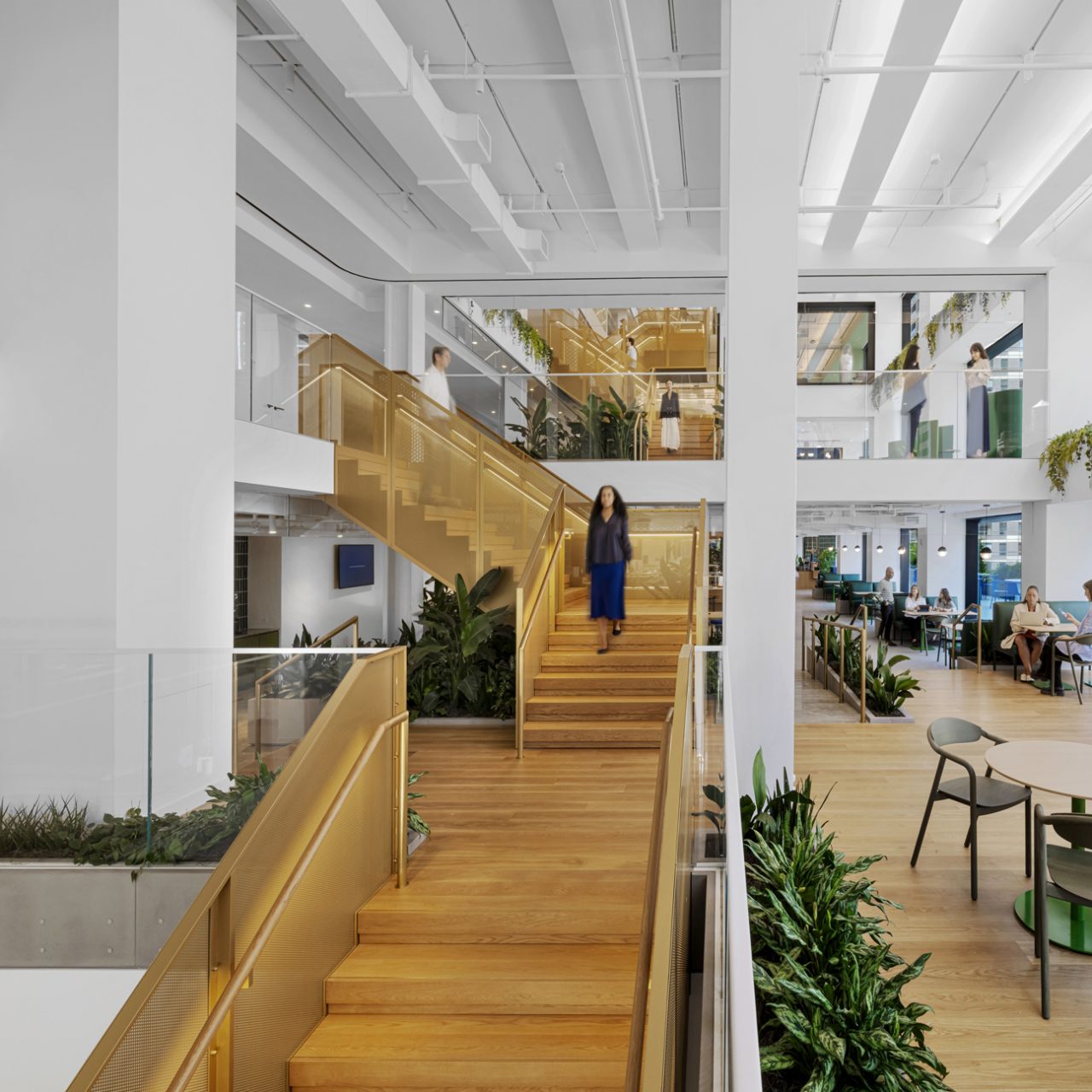 The workplace features a central atrium of cascading, staff-focused spaces, connecting all seven of the floors it will occupy together in a continuous, activated “Avenue” that is designed to curate and support informal interactions among people.